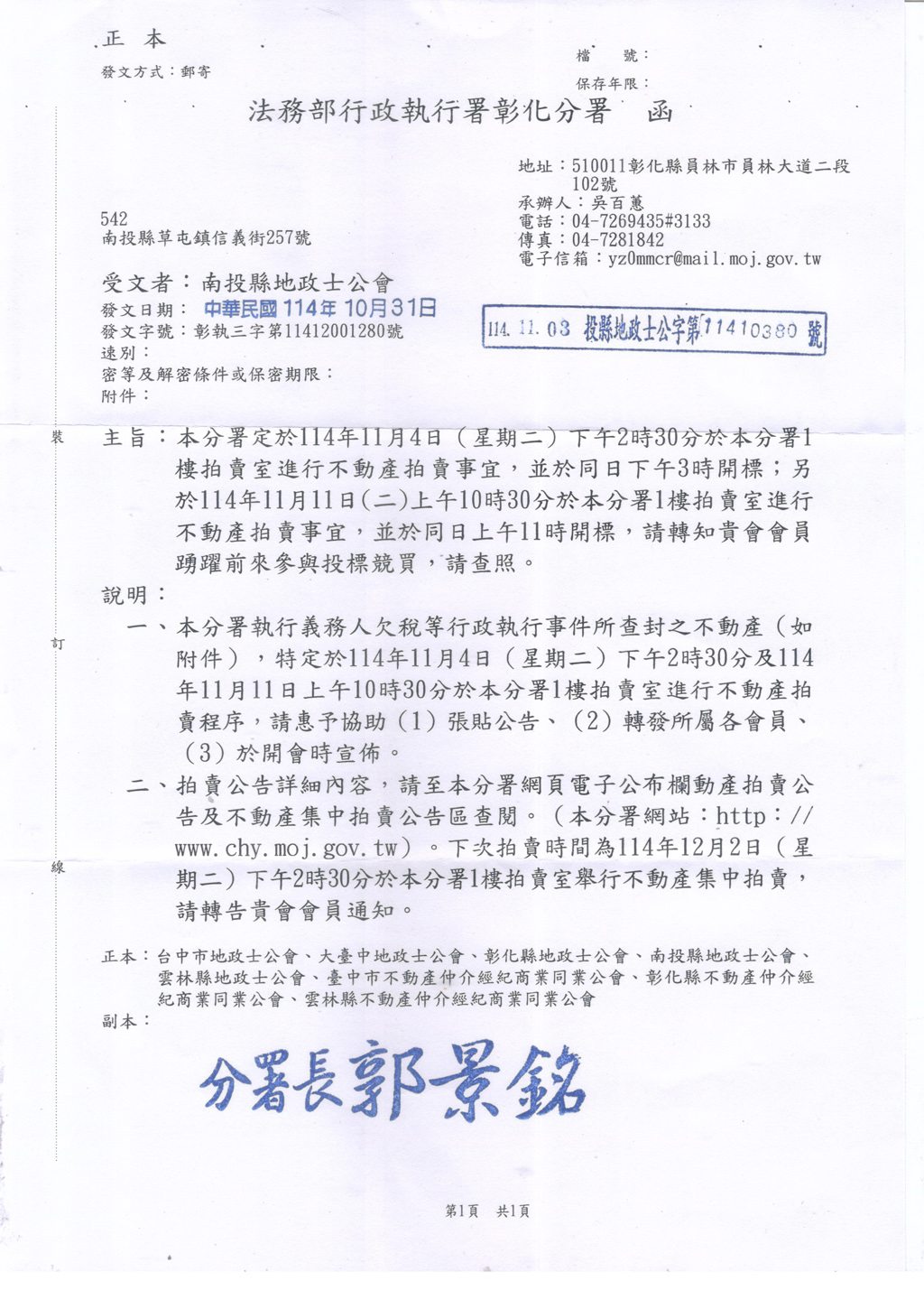 114年11月4日(星期二)下午2時30分於法務部行政執行署彰化分署1樓進行不動產拍賣事宜另於114年11月11日(二)上午10時30分於本分署1樓拍賣室進行不動產拍賣事宜,並於同日上午11時開標拍賣公告詳細內容,請至分署網頁電子公佈欄動產拍賣公告及不動產集中拍賣公告區查閱。連結網站http://www.chy.moj.gov.tw